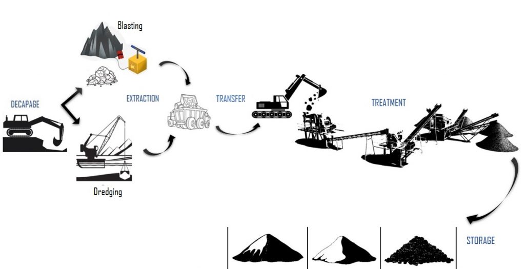 Submerged land: extraction is done directly on the bank if the site is submerged and shallow with cable shovels (dragline), bucket excavators or with hydraulic shovels. On the other hand, on deep submerged sites, extraction is carried out by hydraulic pumping with a suction pipe connected to a pump.